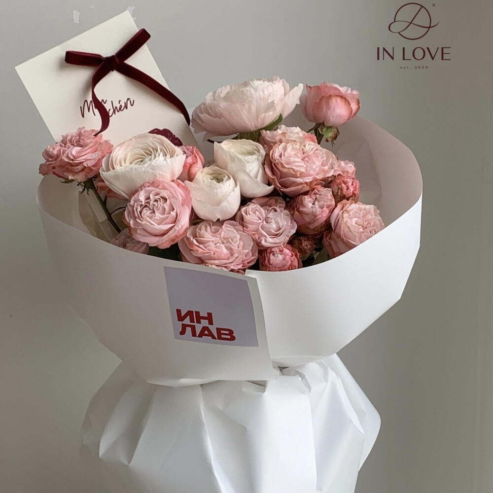 Пион раушандары мен ранункулус гүлдерінен жасалған, нәзік сәндік екпіндері бар ұнтақталған қызғылт реңктердегі нәзік гүл шоғы. Ашық күңгірт қаптамада оралған, ол открыткамен және лентамен бірге келеді. Бұл әсем және кең гүл шоғы туған күнге, романтикалық кешке немесе ерекше қимылға өте ыңғайлы.