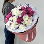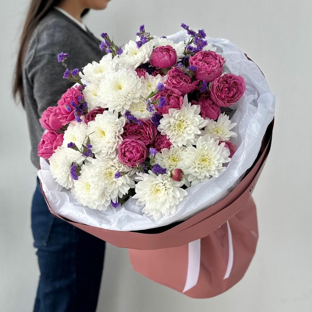 Букет из кустовых пионовидных роз, статицы и хризантем - подойдёт как для искреннего признания, так и для тёплого поздравления