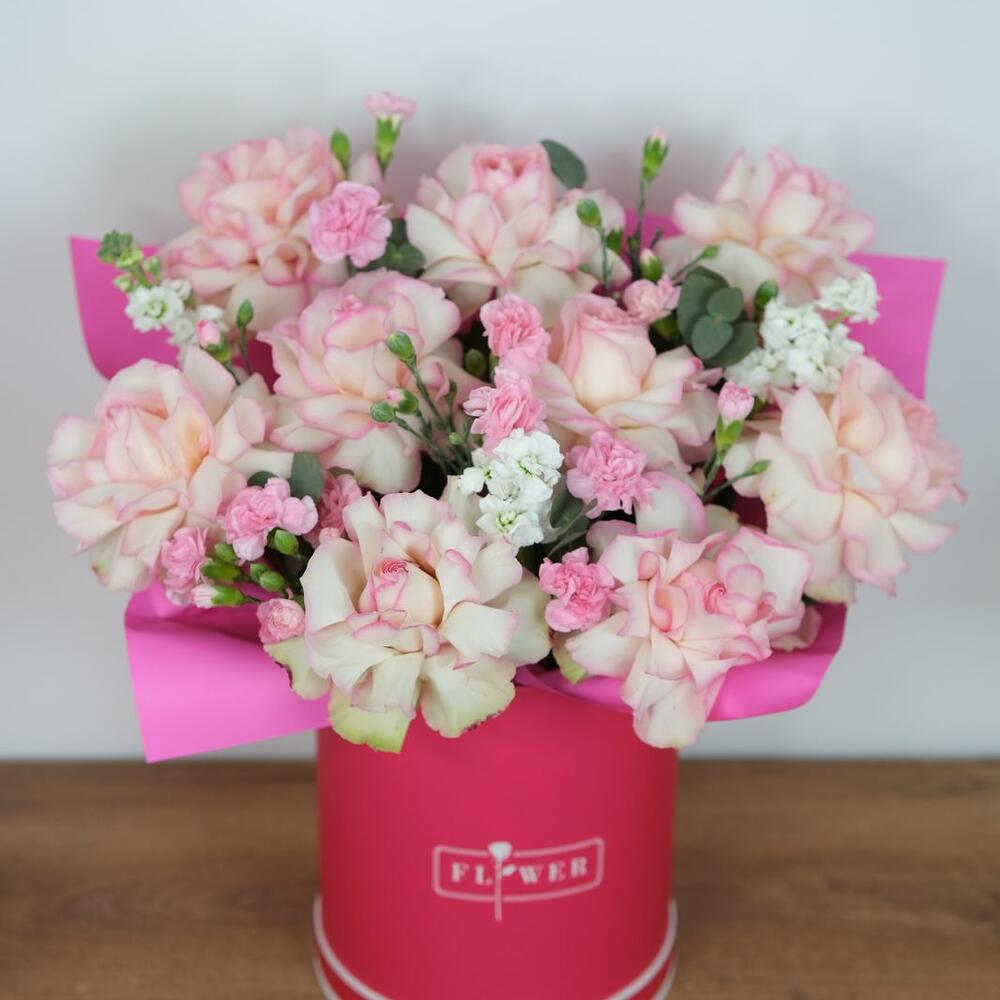 Букет “Розовое наслаждение” — это праздник нежности и стиля. Кремово-розовые розы с тонкой каймой, воздушные гвоздики и душистые маттиолы собраны в гармоничную композицию, наполняющую пространство теплом и утончённой красотой. Эвкалипт добавляет зелёных акцентов, а ярко-розовая коробка делает букет особенно выразительным. Идеальный выбор для поздравлений, романтических моментов и трогательных жестов внимания.