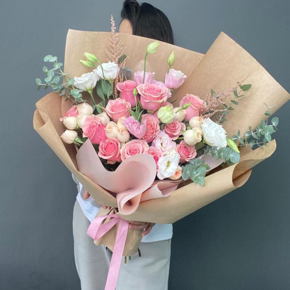 Лизиантус - 5 дана Эвкалипт - 3 дана Сухоцветы - 3 дана Спрей роза - 4 дана раушан - 11 дана