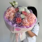 Гортензия - 2 дана Хризантема бұтасы - 1 дана Эустома - 1 дана Диантус - 3 дана Роза фиолетовая - 5 дана Дизайнерлік қаптама - 5 дана
