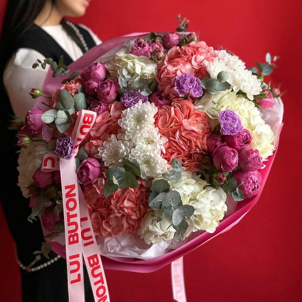 Эвкалипт - 3 дана Диантус - 5 дана хризантемы - 5 дана гортензии - 8 дана бұта раушандары - 8 дана