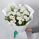 Элегантный и сдержанный букет в бело-зелёной гамме, олицетворяющий чистоту, спокойствие и гармонию. Белоснежная эустома в сочетании с веточками гиринбела создаёт изысканную композицию, которая подойдёт как для особого повода, так и в качестве знака уважения и признательности. Идеален для подарка в деловой обстановке или выражения искренних чувств.