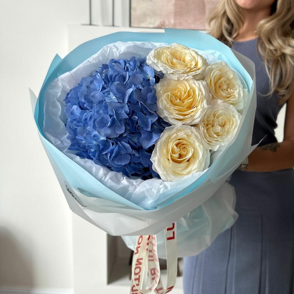 Букет из голландской гортензии и пионовидных роз, который делает момент особенным