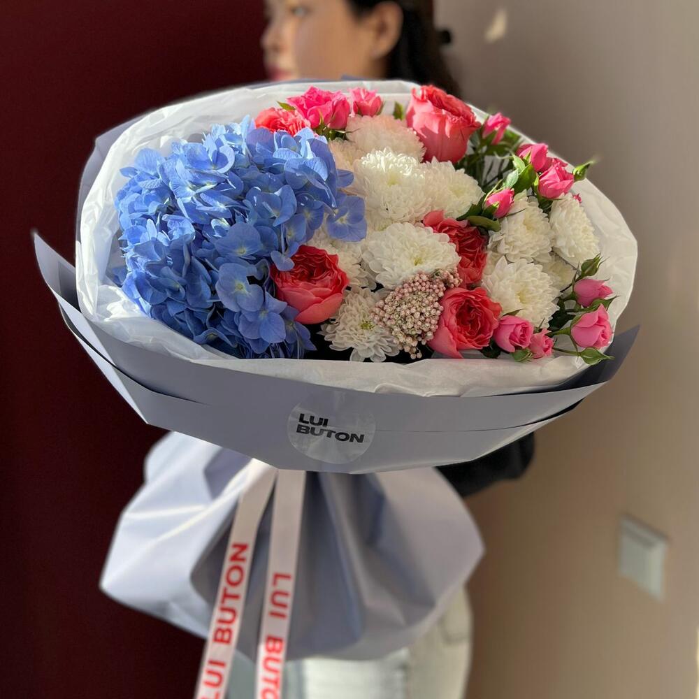 Гортензия - 1 дана Озотамнус - 1 дана хризантемы - 3 дана пионовидные розы - 5 дана бұта раушандары - 3 дана