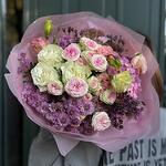 Бұта раушаны - 3 дана Хризантема бұтасы - 5 дана Раушан - 3 дана Эустома - 3 дана Дизайнерлік қаптама - 1 дана