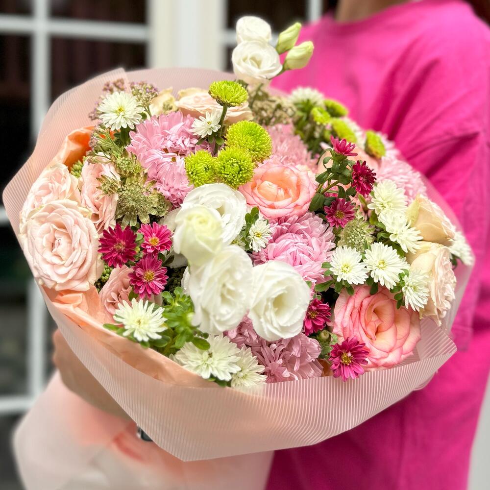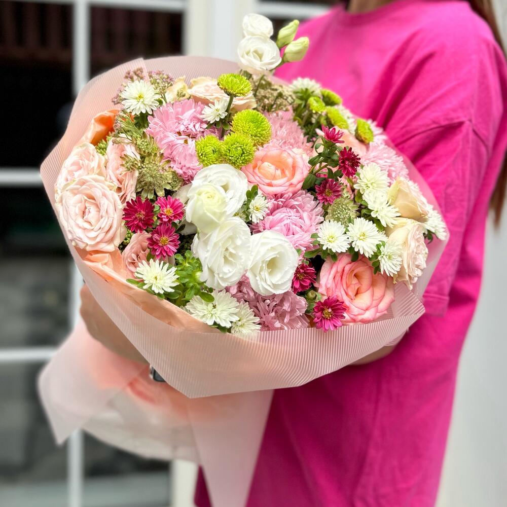 Эустома - 3 дана Бұта раушаны - 2 дана Эквадор раушаны - 3 дана Дизайнерлік қаптама - 1 дана Жасыл үкі - 2 дана астерлер букеті - 2 дана