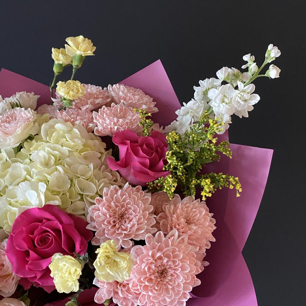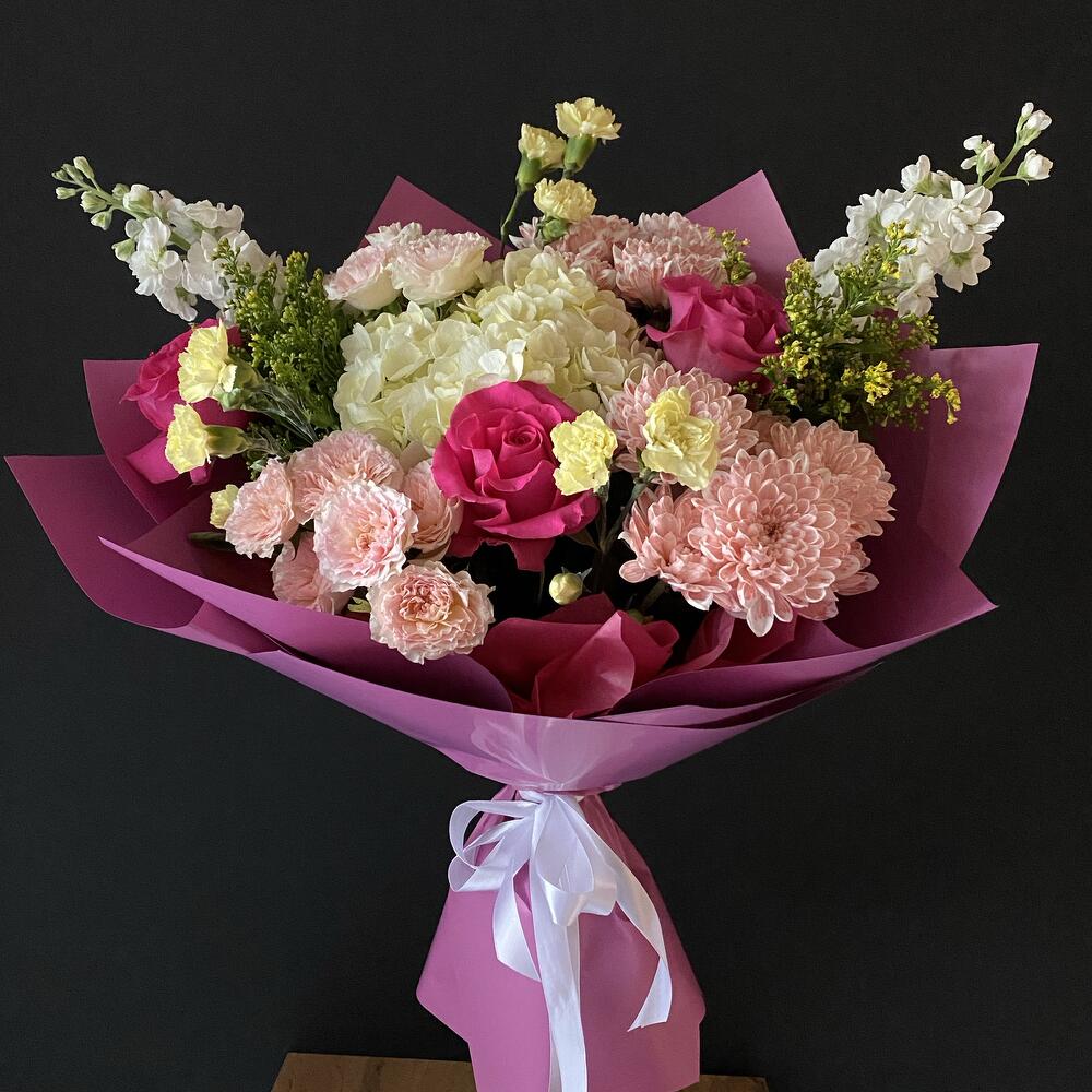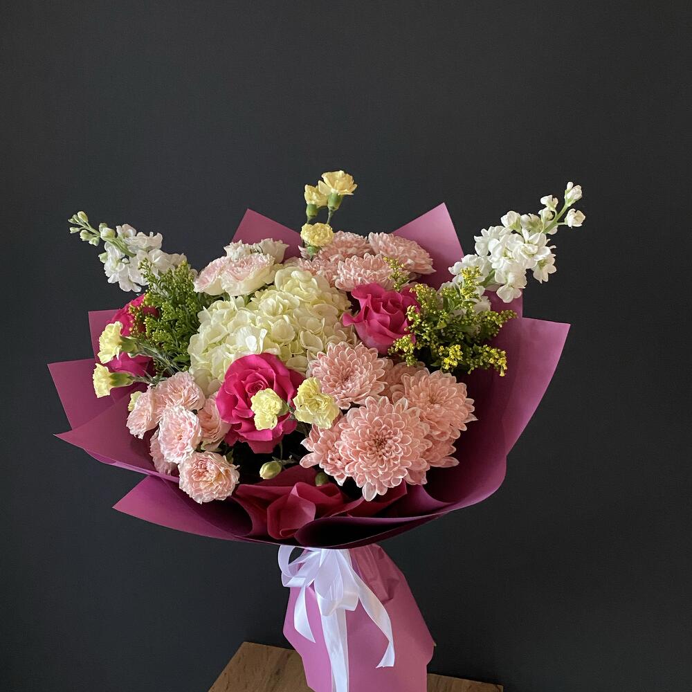 Гортензия - 1 дана Маттиола - 2 дана Солидаго - 2 дана Раушан - 3 дана Диантус - 2 дана Безендіру - 1 дана Роза спрей - 2 дана Сіздің тілектеріңіз жазылған ашықхат - 1 дана алтай хризантема - 2 дана