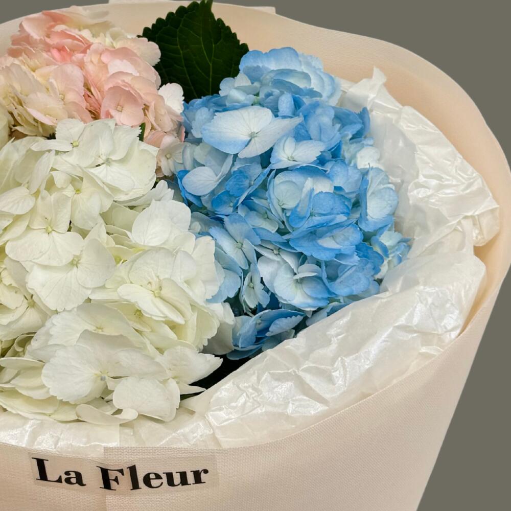 Легкий и стильный букет из трех гортензий разных оттенков — как нежная акварель. Отличный выбор на день рождения или просто чтобы порадовать. Идеален для фото!