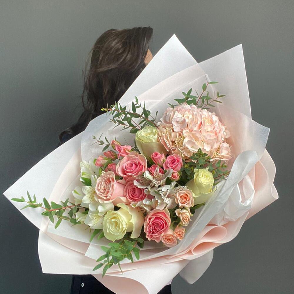 Альстроэмерия - 3 дана Гортензия - 1 дана Раушан - 5 дана Бұта раушаны - 2 дана