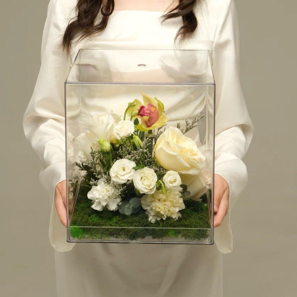 Лимониум - 1 дана Гвоздика - 3 дана Эустома - 3 дана орхидея - 1 дана Кептірілген гүл - 2 дана Мох стабилизированный - 2 дана Акриловый бокс - 1 дана candy light роза - 2 дана