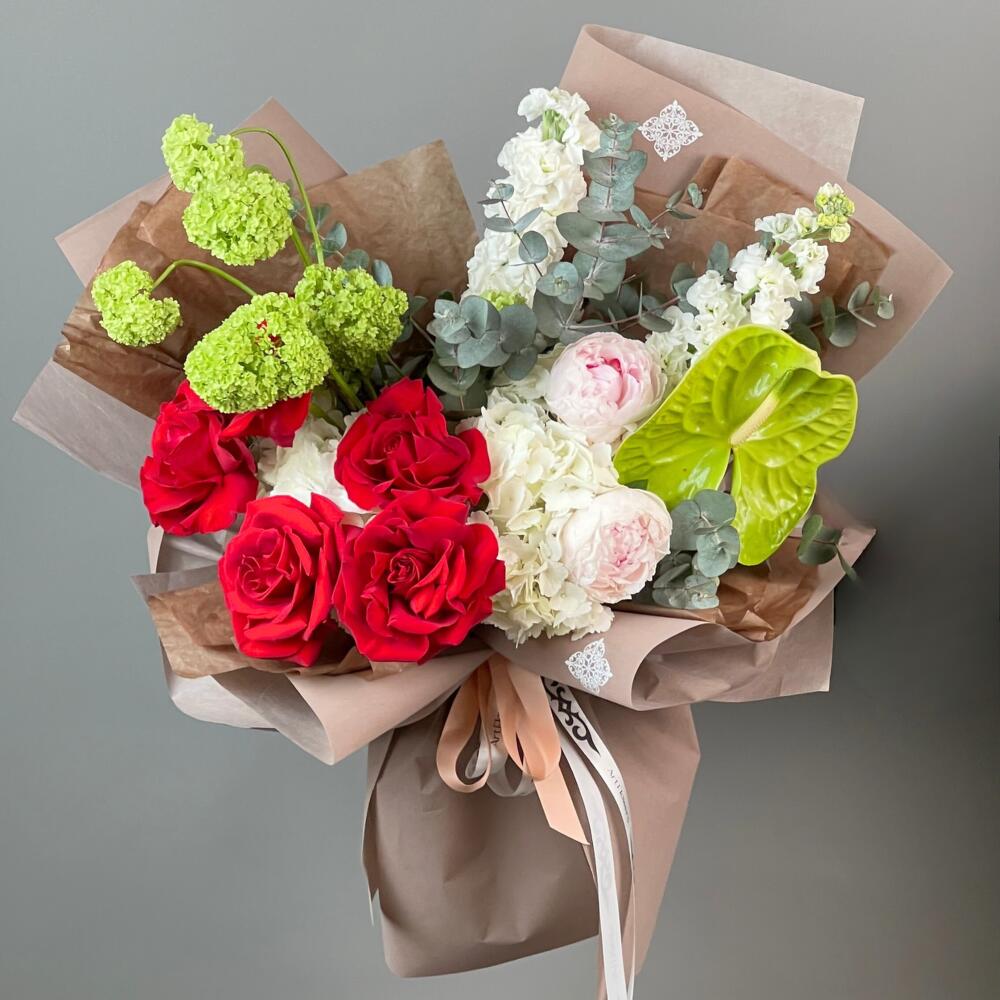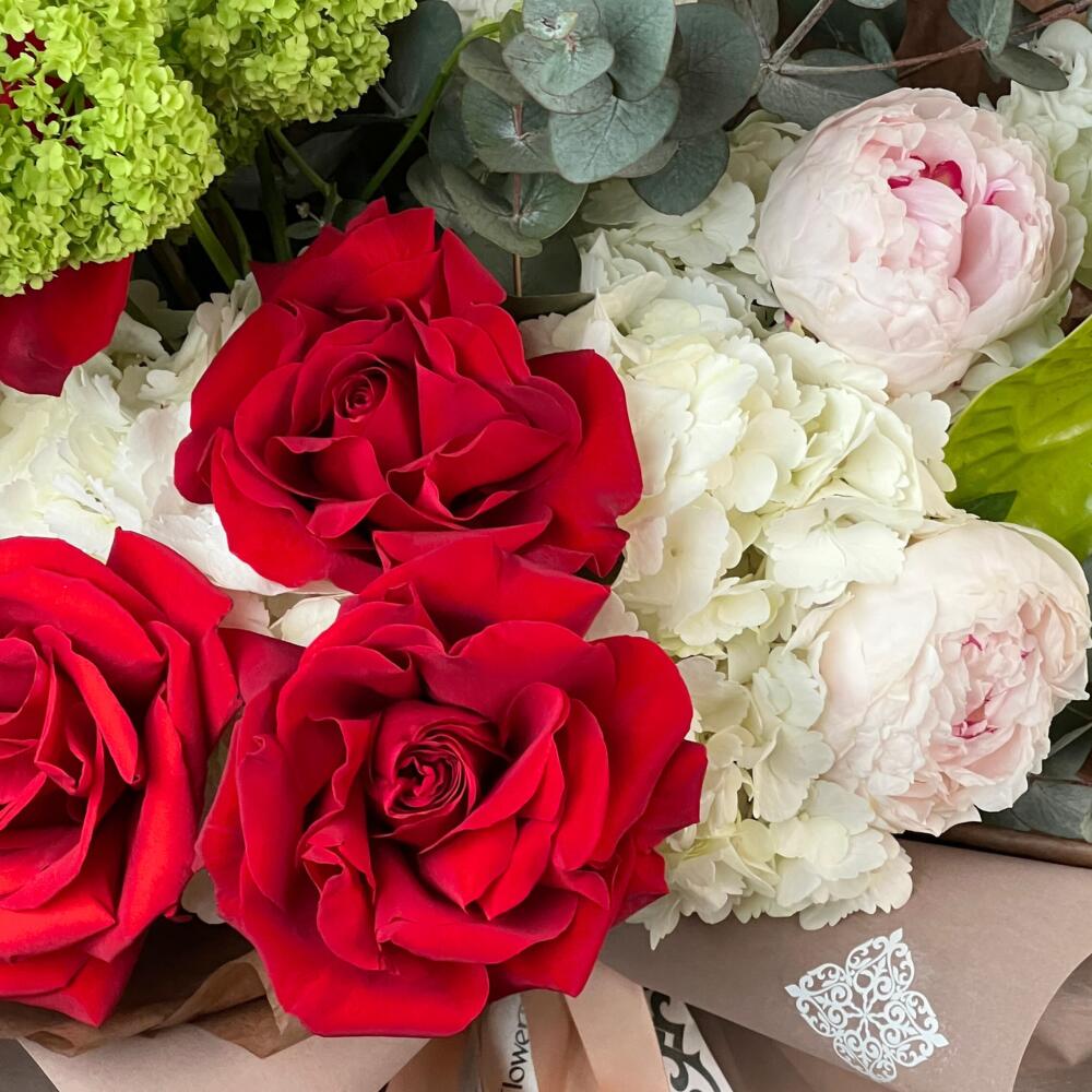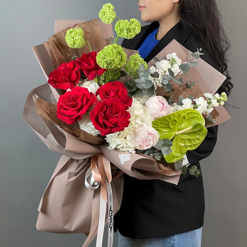 Антуриум - 1 дана Вибурнум - 3 дана Гортензия - 2 дана Маттиола - 2 дана Пион - 2 дана Эвкалипт - 1 дана Раушан - 5 дана