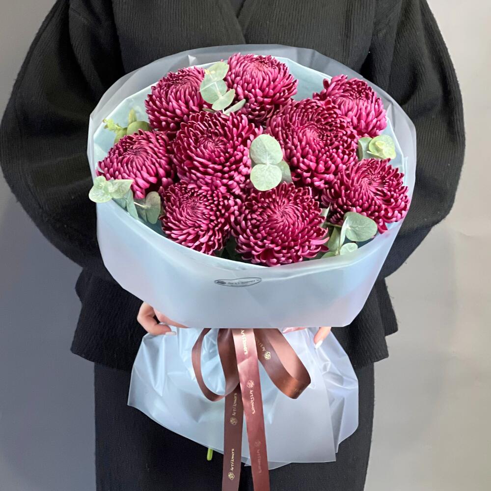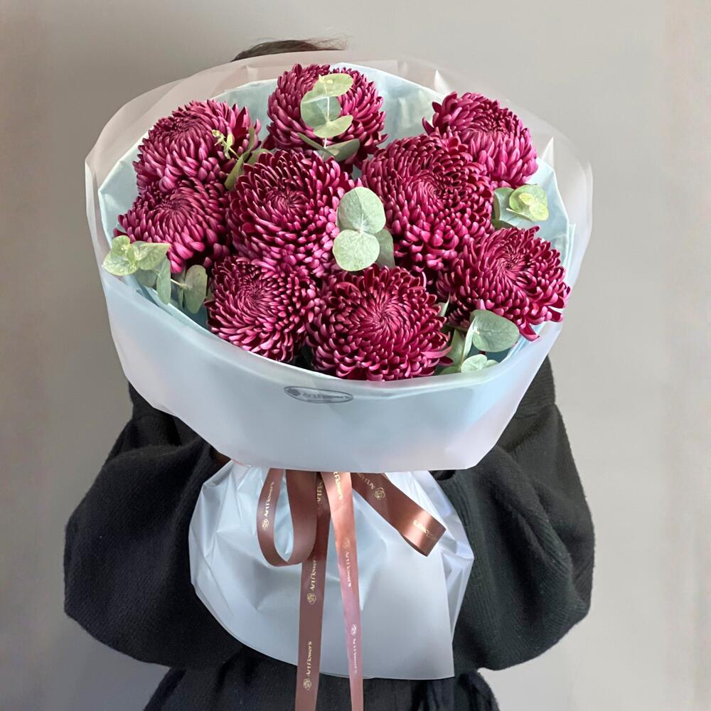 Насыщенные бордовые хризантемы создают атмосферу страсти и роскоши. Каждый цветок раскрывает глубину тона и элегантность формы.