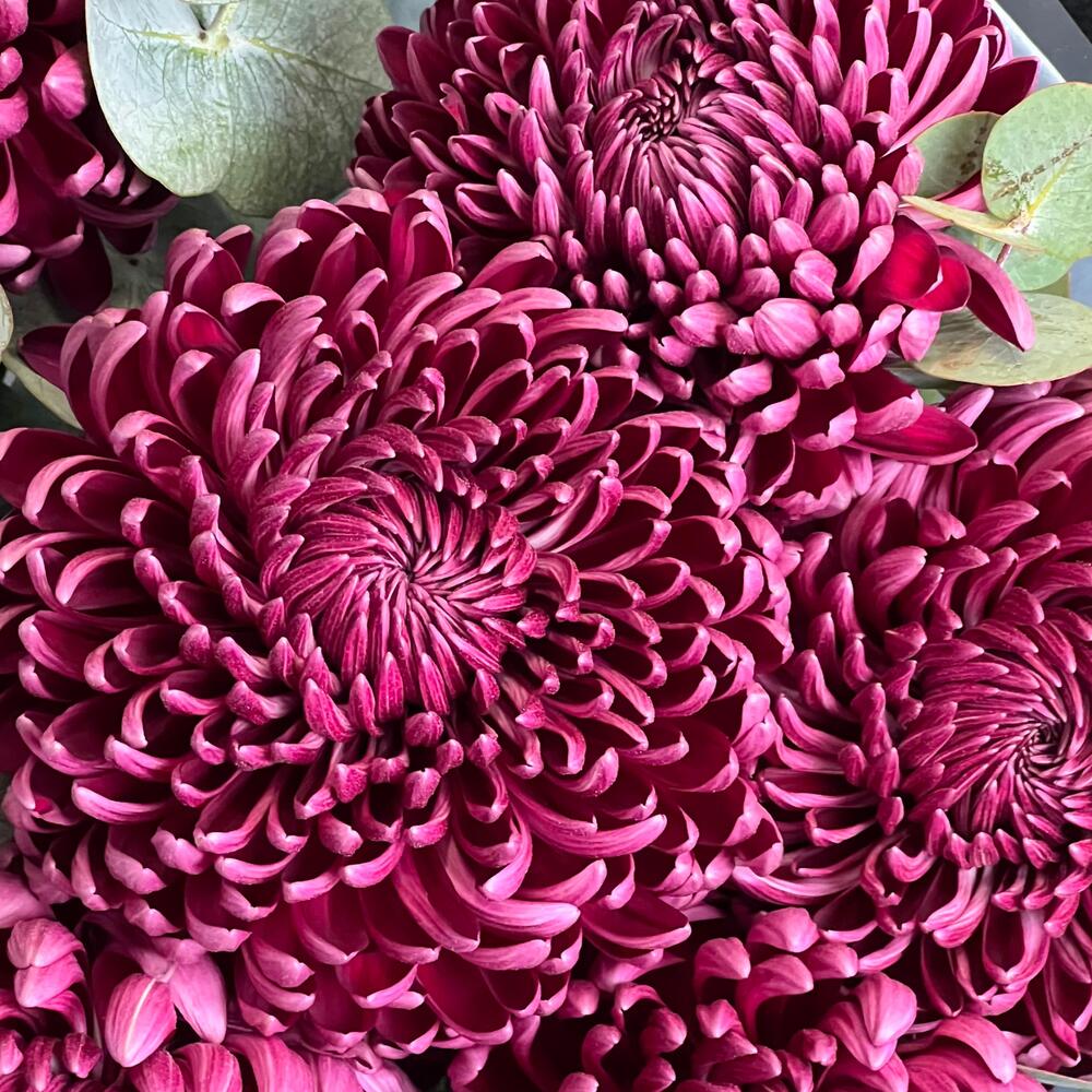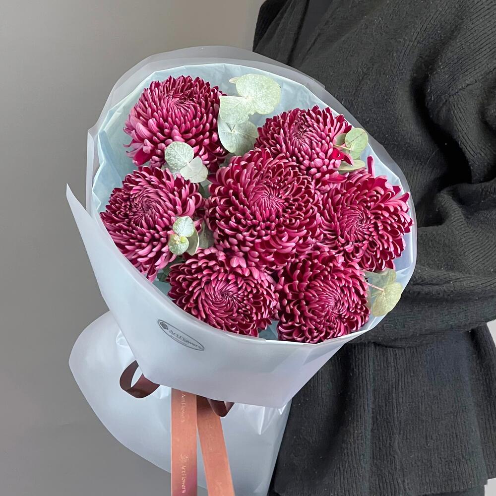 Стильный букет из винных хризантем «бигуди» — компактный, выразительный и с характером. Отличный выбор, если хочется удивить изысканным оттенком.