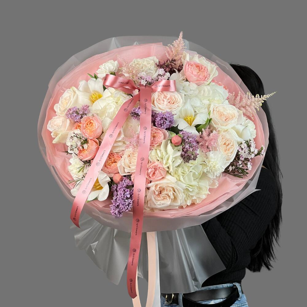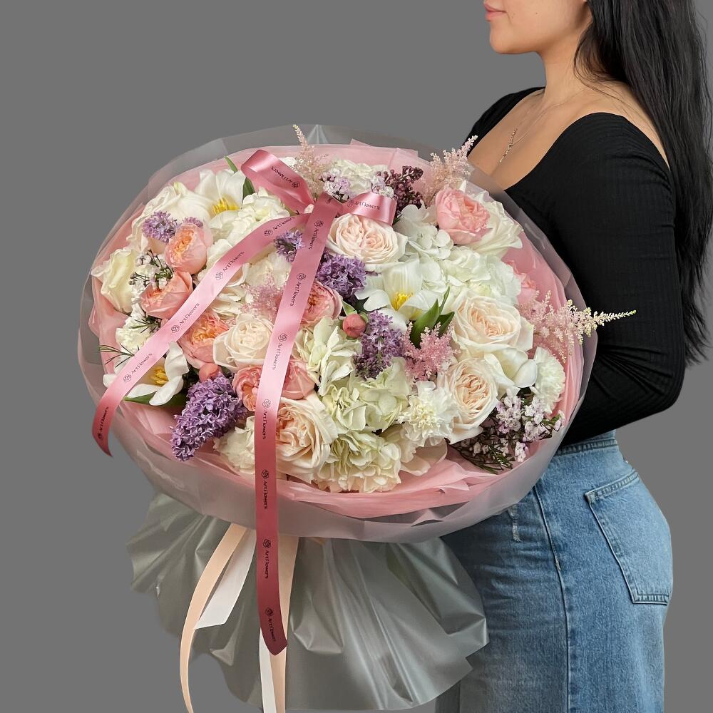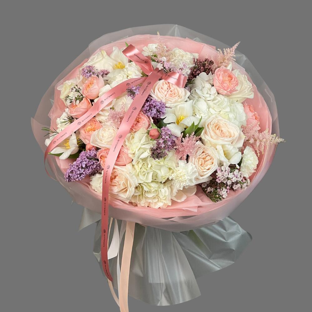 Астильба - 5 дана Ваксфлауэр - 3 дана Гортензия - 5 дана Сирень - 5 дана Раушан - 9 дана Гвоздика - 5 дана Роза Джульетта - 3 дана
