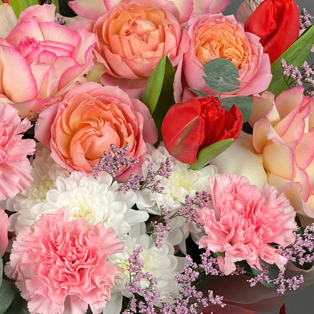 Лимониум - 4 дана Қызғалдақ - 3 дана Эвкалипт - 1 дана Раушан - 4 дана Хризантема - 1 дана Гвоздика - 3 дана раушан спрейі - 2 дана