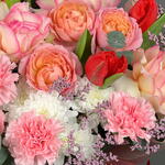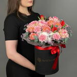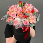 Бұл букет — жай ғана сыйлық емес, ол мағыналы қимыл. Ол қамқорлық пен ілтипатты, сондай-ақ жай гүлдерден артық нәрсе бергің келетін сол сезімді білдіреді. Қызғылт-шабдалы реңктері нәзік көрінеді, бірақ қара қораппен үйлескенде қымбат, мәртебелі сыйлық әсерін тудырады. Қызыл лента оған құштарлық пен сенімділік сезімін қосады.