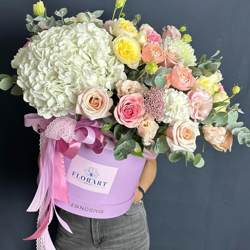 Гортензия - 2 дана Лизиантус - 2 дана Озотамнус - 1 дана Эвкалипт - 2 дана Раушан - 15 дана Бұта раушаны - 5 дана Хризантема - 2 дана
