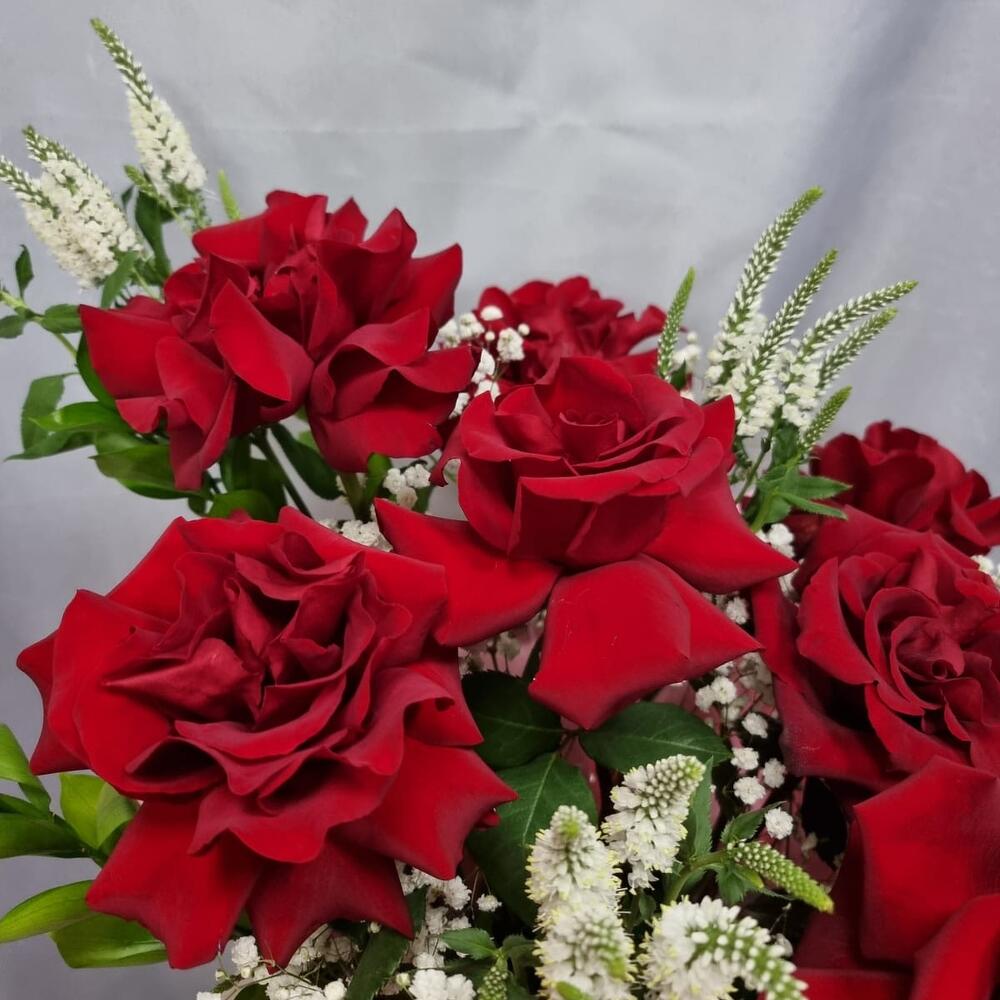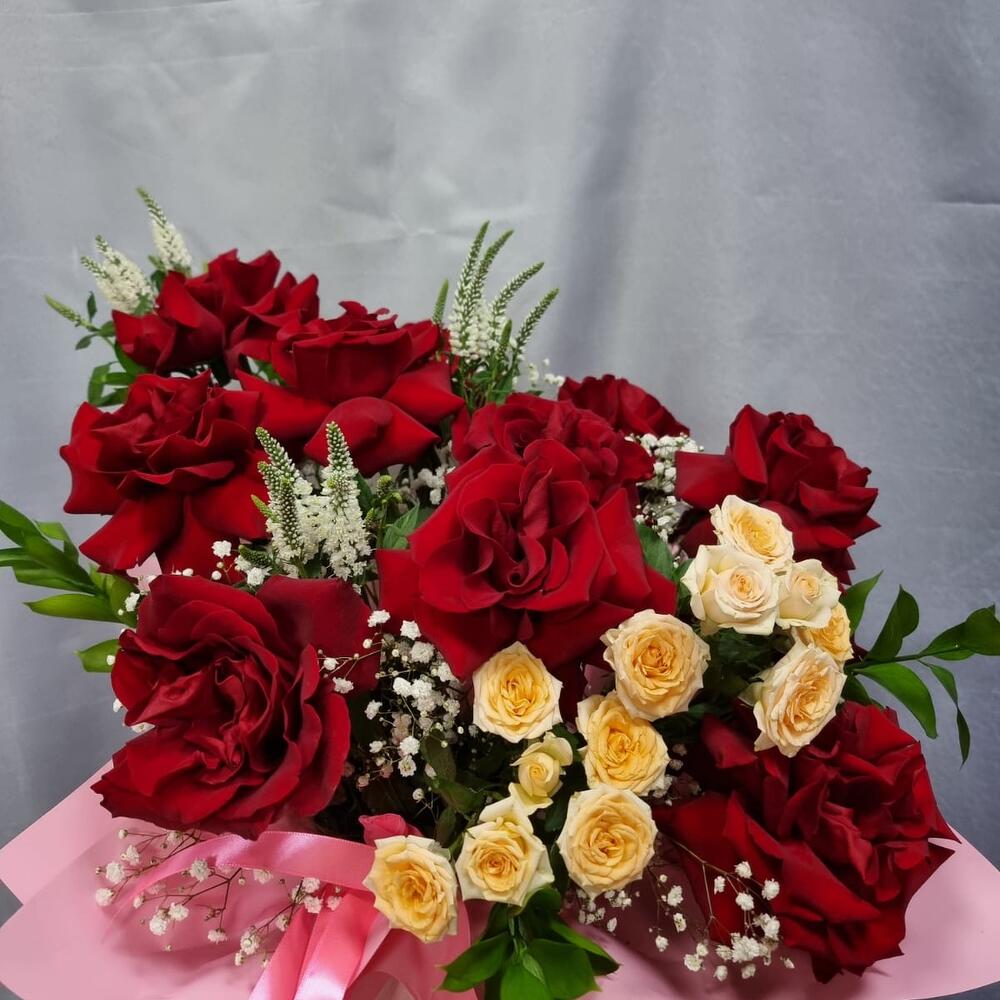 Бұта раушаны - 2 дана Рускус - 5 дана Бас киім қорабы - 1 дана Дизайнерлік қаптама - 1 дана Флористикалық Оазис - 2 дана Гипсофила Белая - 1 дана роза эксплорер эквадор - 11 дана вероника белая кустовая - 3 дана