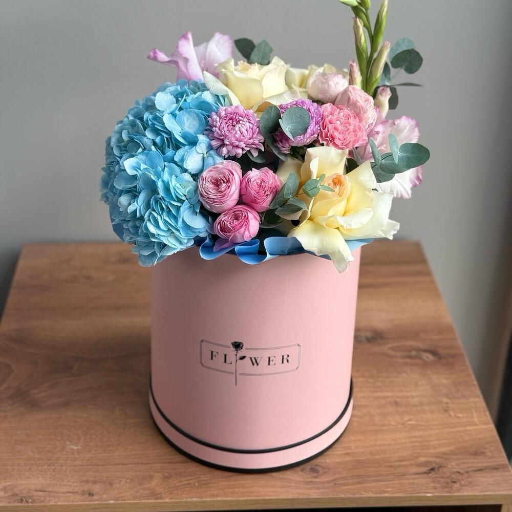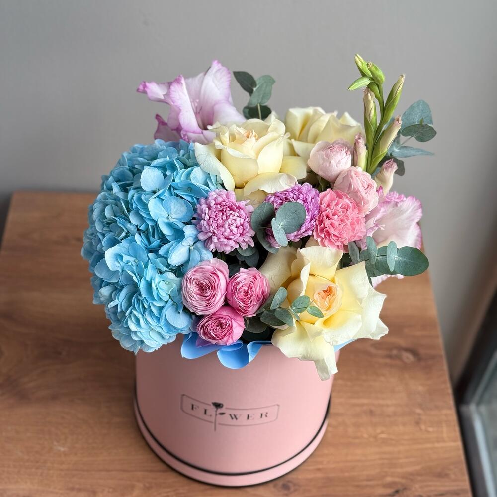 Астра - 1 дана Гортензия - 1 дана Эвкалипт - 1 дана Раушан - 3 дана Гвоздика - 1 дана Гладиолус - 1 дана Спрей роза - 2 дана