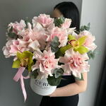 Қораптағы нәзік раушан гүлдері мен орхидеялар композициясы