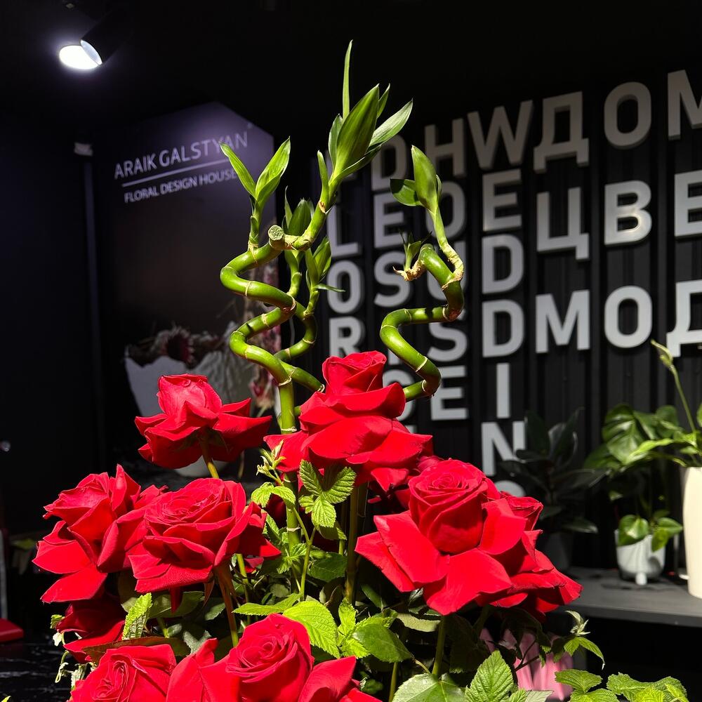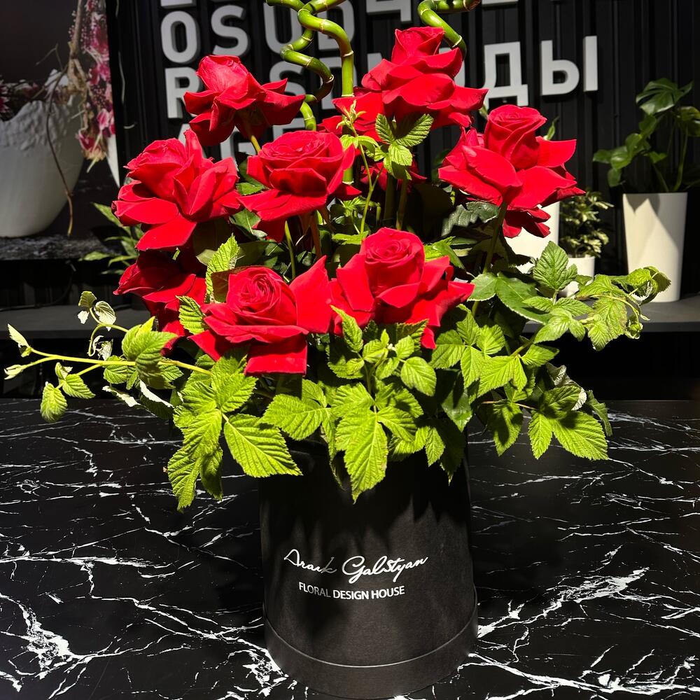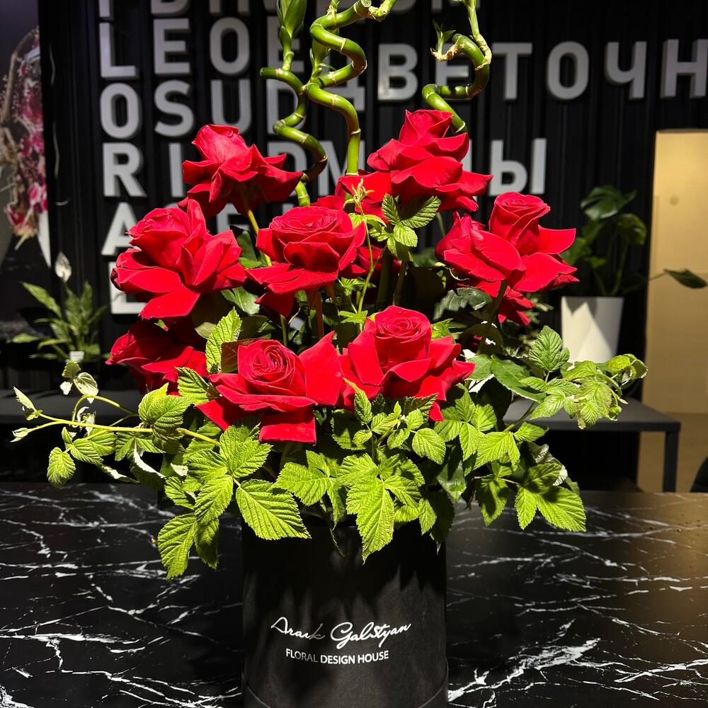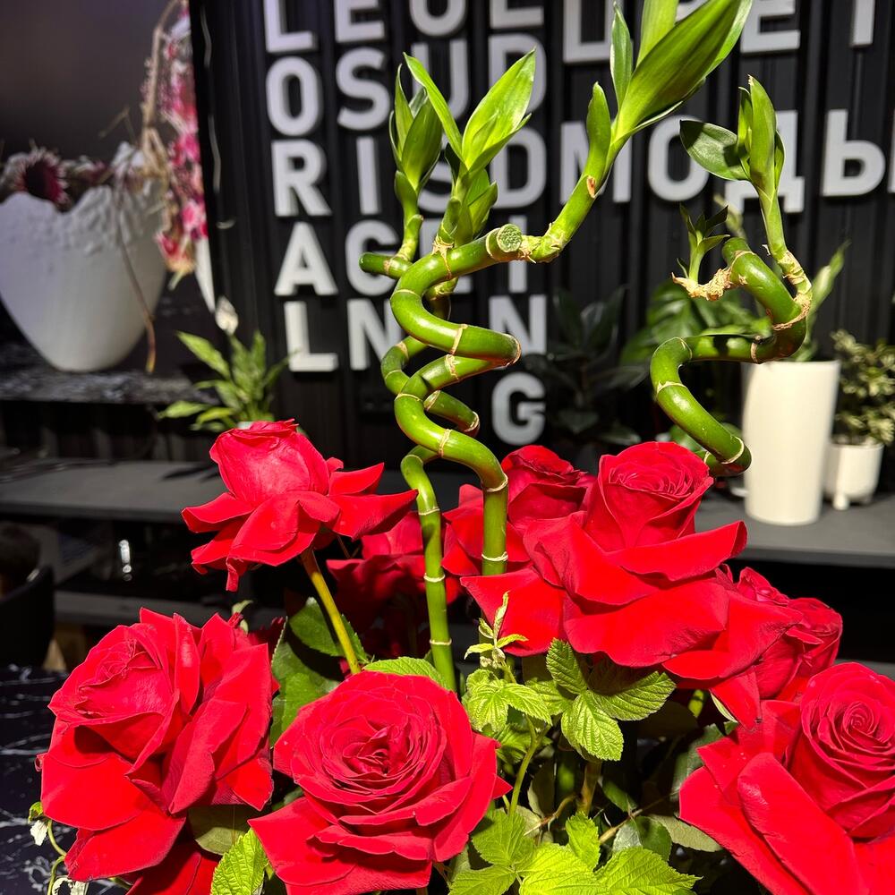 Қызыл раушан мен бамбук бұтақтары бар авторлық қорап — сұлулық пен әсемдікті үйлестіретін стильді әрі талғампаз сыйлық. Қызыл раушан — құмарлық пен махаббаттың символы, ал бамбук — күш пен төзімділіктің белгісі. Мұндай композиция кез келген мереке немесе ерекше оқиға үшін қолайлы болып, сәтке ерекше мән мен нәзіктік қосады.