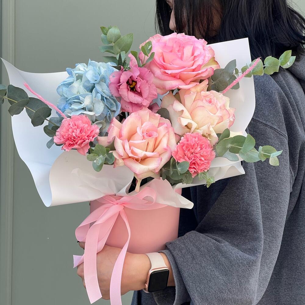 Гортензия - 1 дана Эвкалипт - 1 дана Эустома - 1 дана Диантус - 2 дана Қорап - 1 дана Французская роза - 3 дана