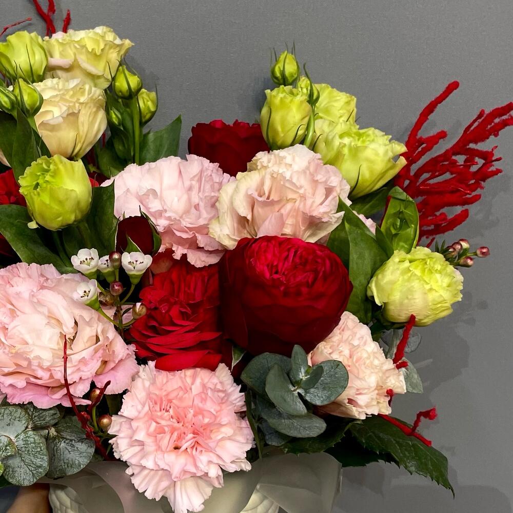 Ваксфлауэр - 1 дана Лизиантус - 4 дана Гвоздика - 2 дана Эвкалипт Baby Blue - 1 дана Red Piano кустовая роза - 3 дана ветки декоративные - 2 дана