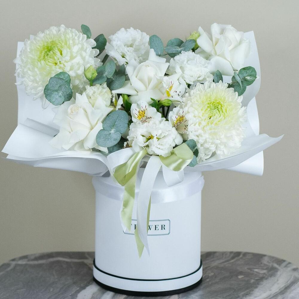 Нежность, утонченность и легкость в каждом лепестке. Этот белоснежный букет — воплощение чистоты и природной гармонии. В составе: 3 элегантные розы Альба, 2 воздушные веточки эустомы, 2 фактурные хризантемы «бигуди», ветка дикой орхидеи с уникальной экзотикой и свежий эвкалипт. Композиция оформлена в стильной коробке с оазисом, что надолго сохраняет её свежесть. Прекрасный выбор для девушки, мамы или просто как знак искренней заботы.