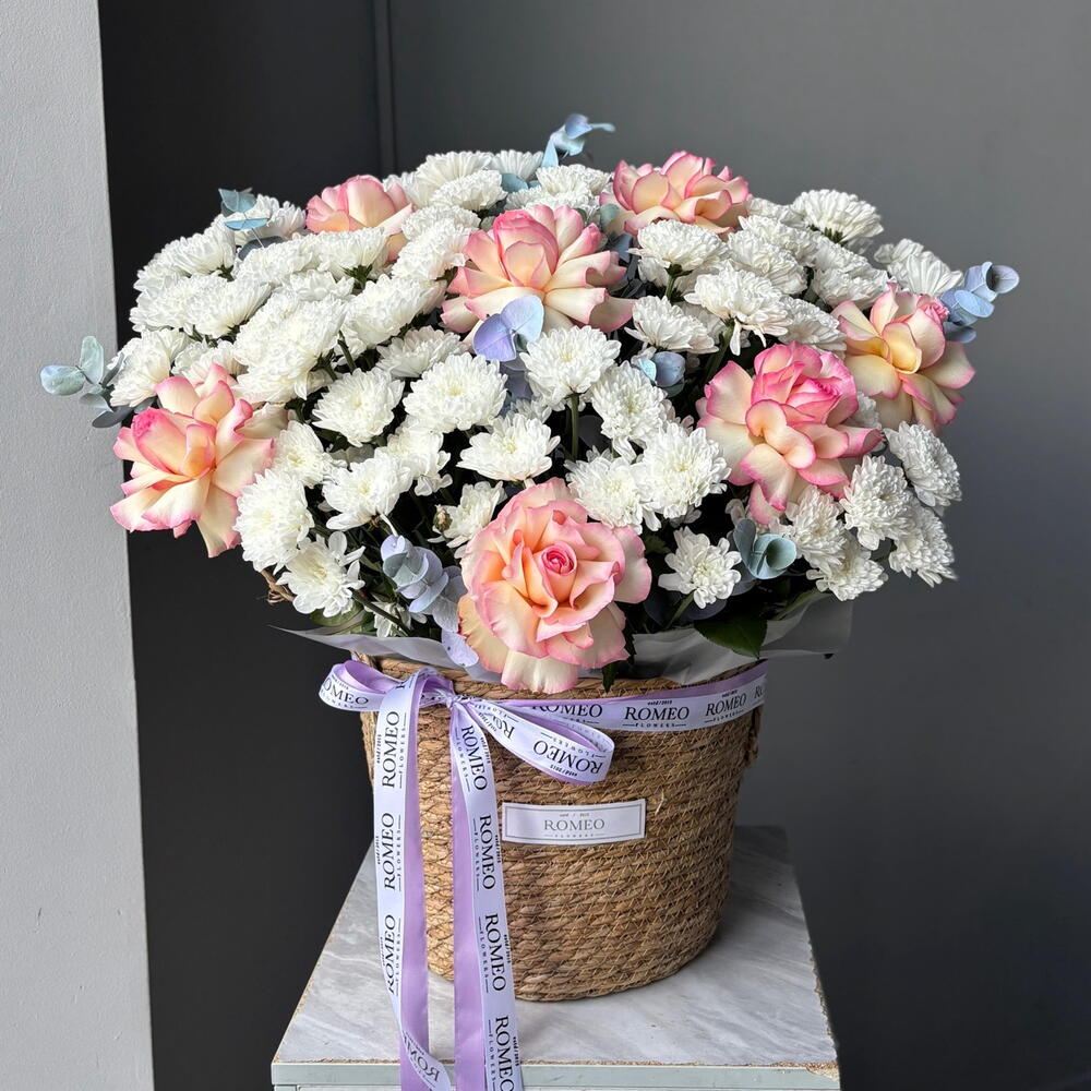 Хризантема бұтасы - 15 дана Эвкалипт - 1 дана Раушан - 7 дана Кашпо - 1 дана Флористикалық Оазис - 3 дана