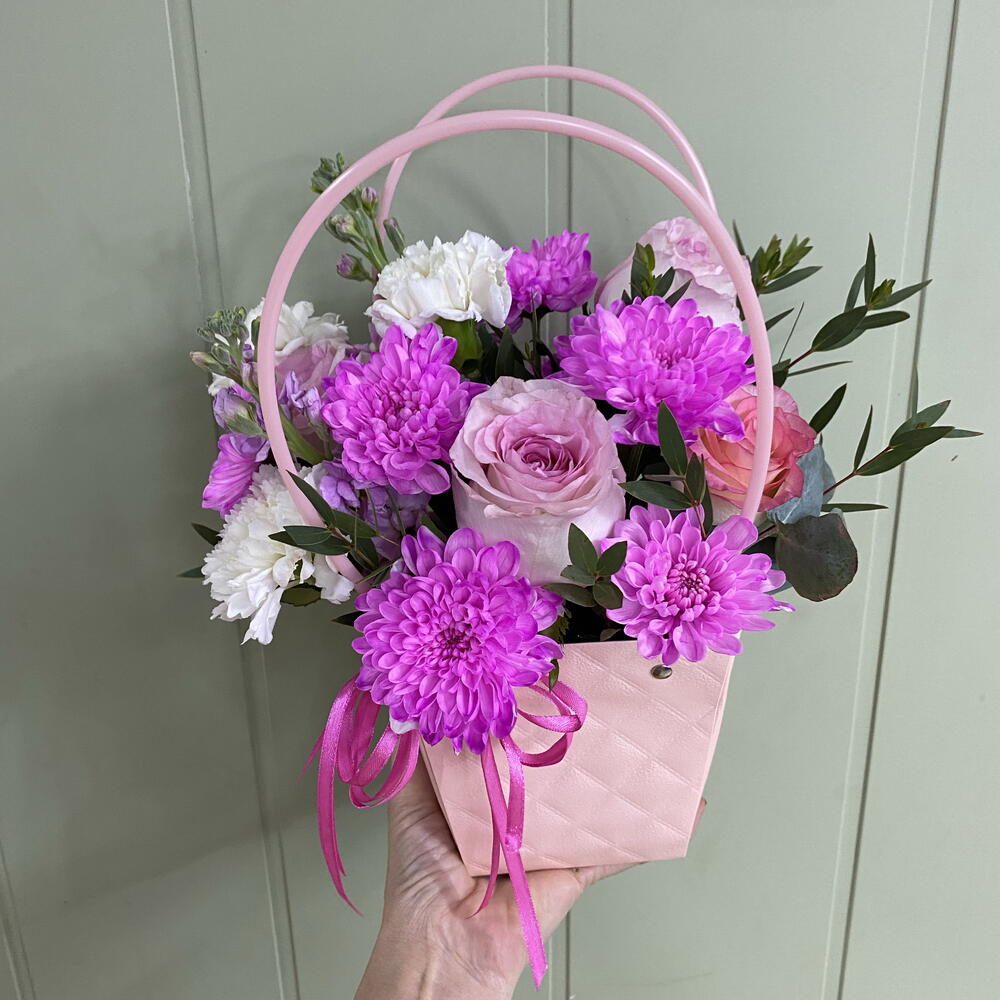 Эвкалипт - 1 дана Роза одноголовая - 3 дана Хризантема кустовая Розовая - 2 дана Маттиола Розовая - 2 дана диантус белый (гвоздика) - 3 дана