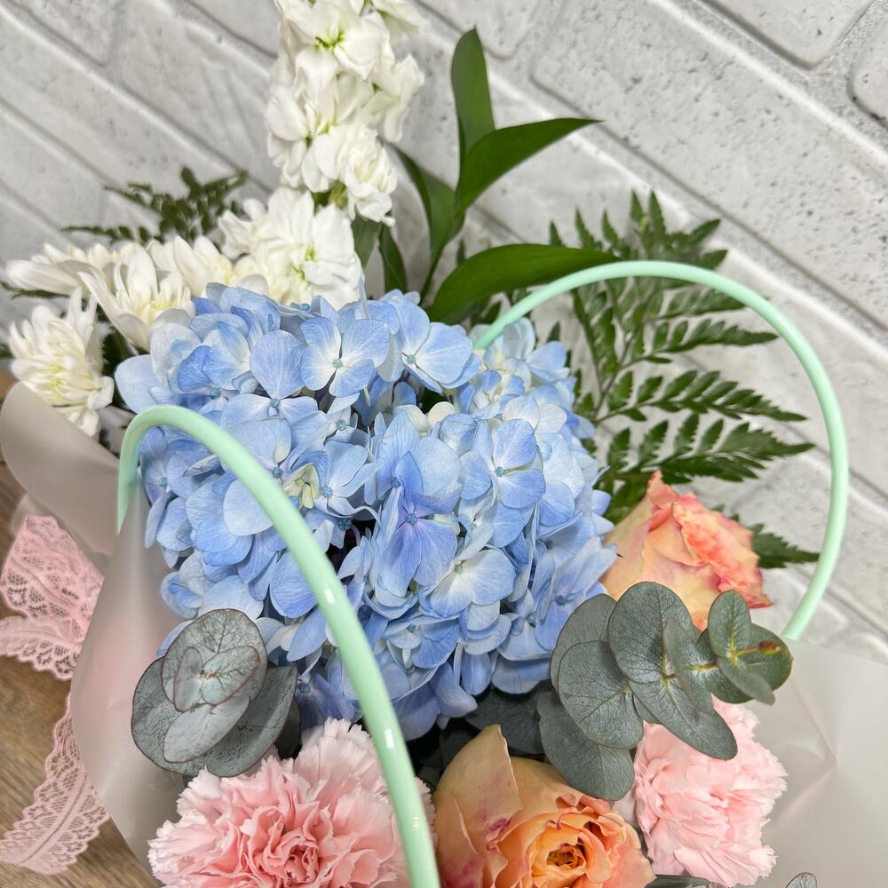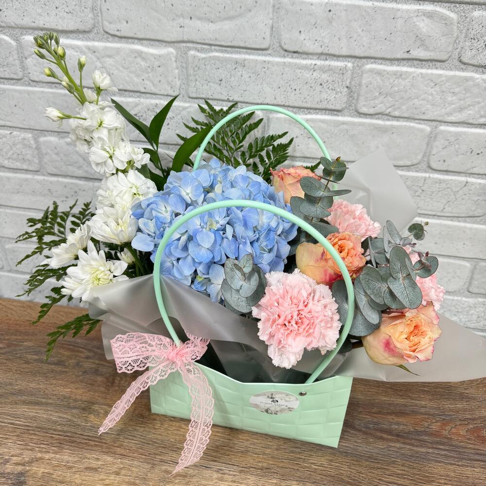 Таспа - 1 дана Маттиола - 1 дана Рускус - 1 дана Хризантема бұтасы - 1 дана Эвкалипт - 2 дана Диантус - 3 дана Ледерварен - 2 дана Гортензия голубая - 1 дана Флористикалық Оазис - 1 дана Сумочка картонная - 1 дана розы пионовидные - 3 дана