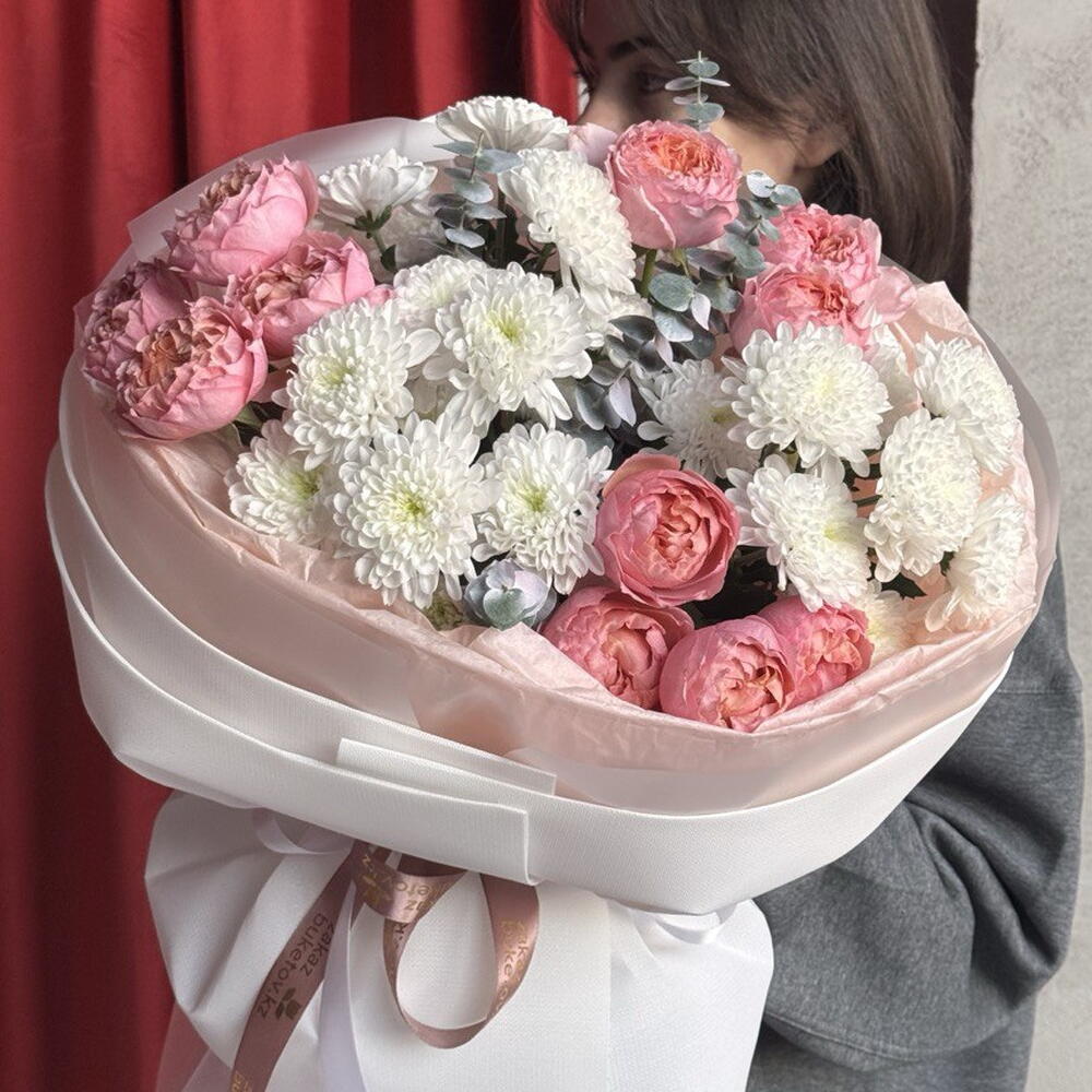 Дарлинг – нәзік букет, жылылық пен жеңіл шармға толы. Пудра түсті раушандар мен аппақ хризантемалардың үйлесімі нәзік реңктердің үндестігін туғызады, ал эвкалипт композицияға сергектік пен жеңілдік қосады.