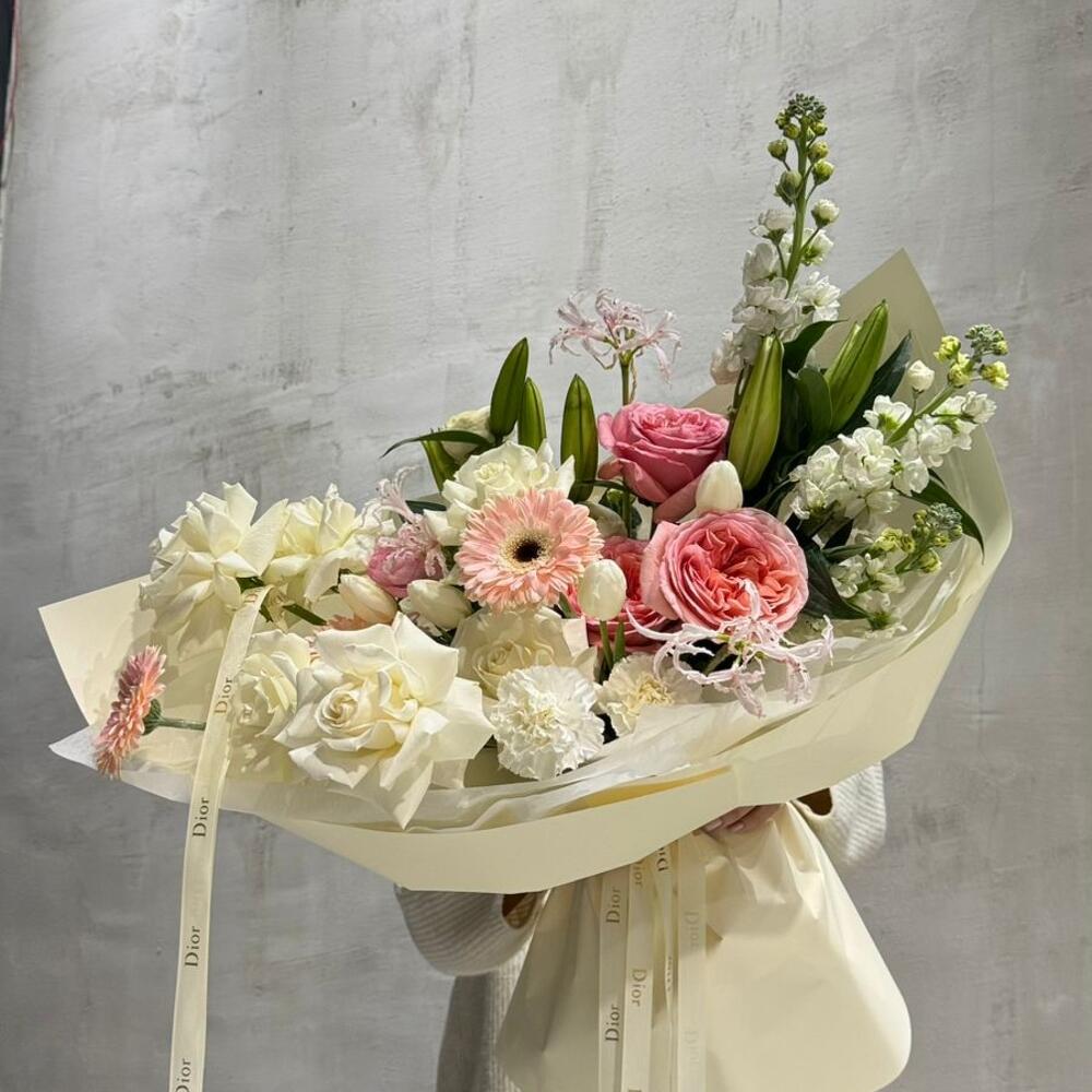 Лилия - 2 дана Маттиола - 3 дана Гербера - 1 дана Диантус - 2 дана Нерина - 2 дана раушан - 7 дана