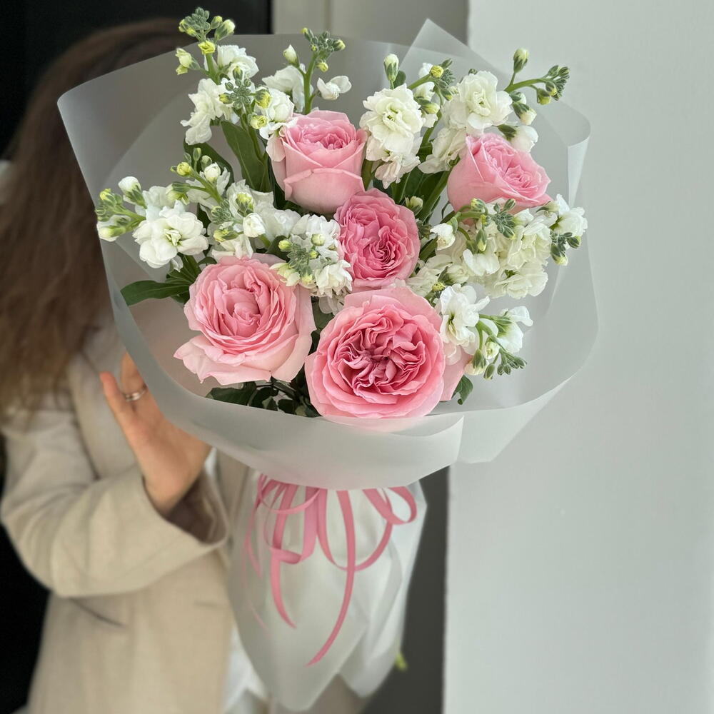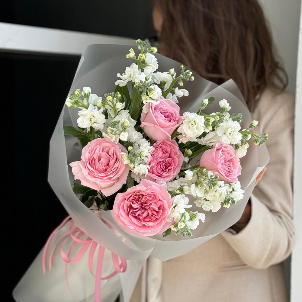 Дуо букет с ароматной матиолой и пионовидной розой