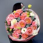Букет не совсем такой как на фото, цветы другие, но смотрится неплохо. Доставка оперативная. Впечатление о магазине сложилось хорошее.