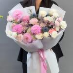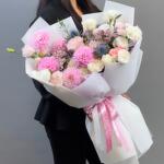 Гортензия - 1 дана Лизиантус - 6 дана Раушан - 5 дана Хризантема - 3 дана Спрей роза - 3 дана георгины - 5 дана фикеум - 1 дана иммозиум - 3 дана