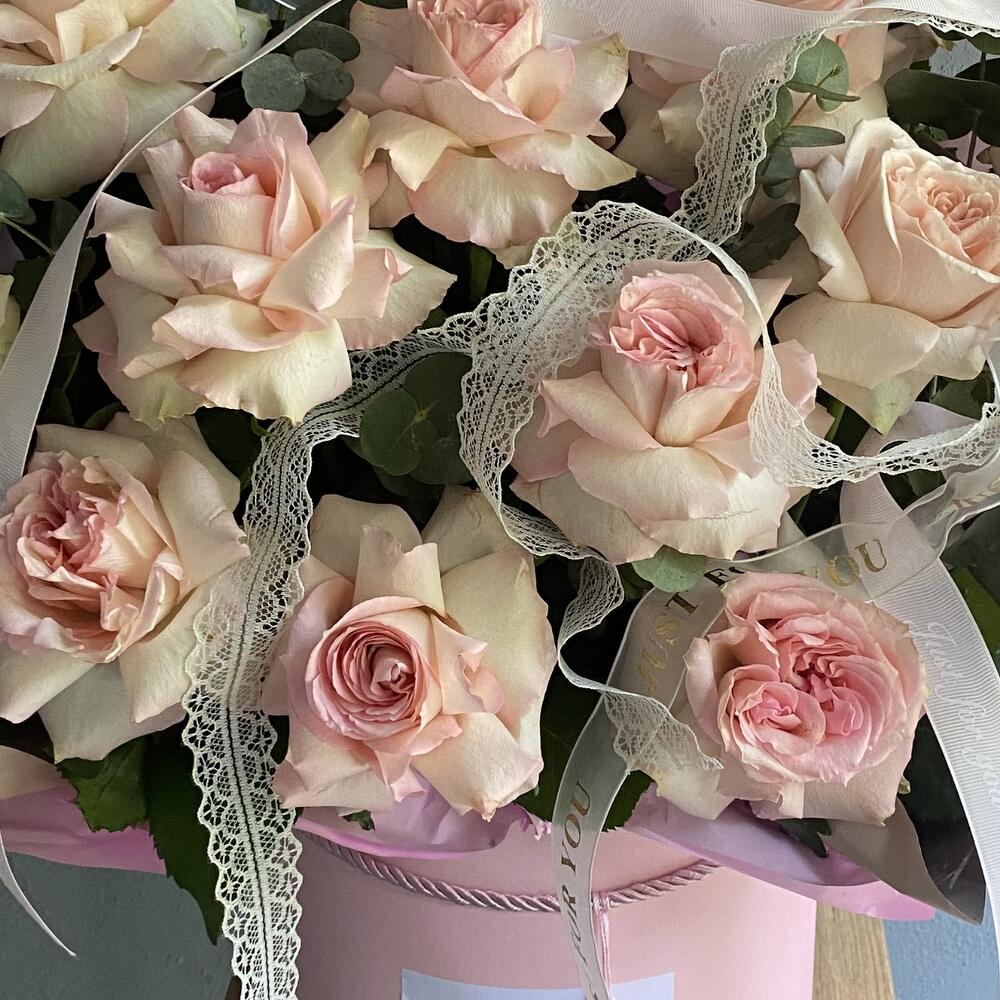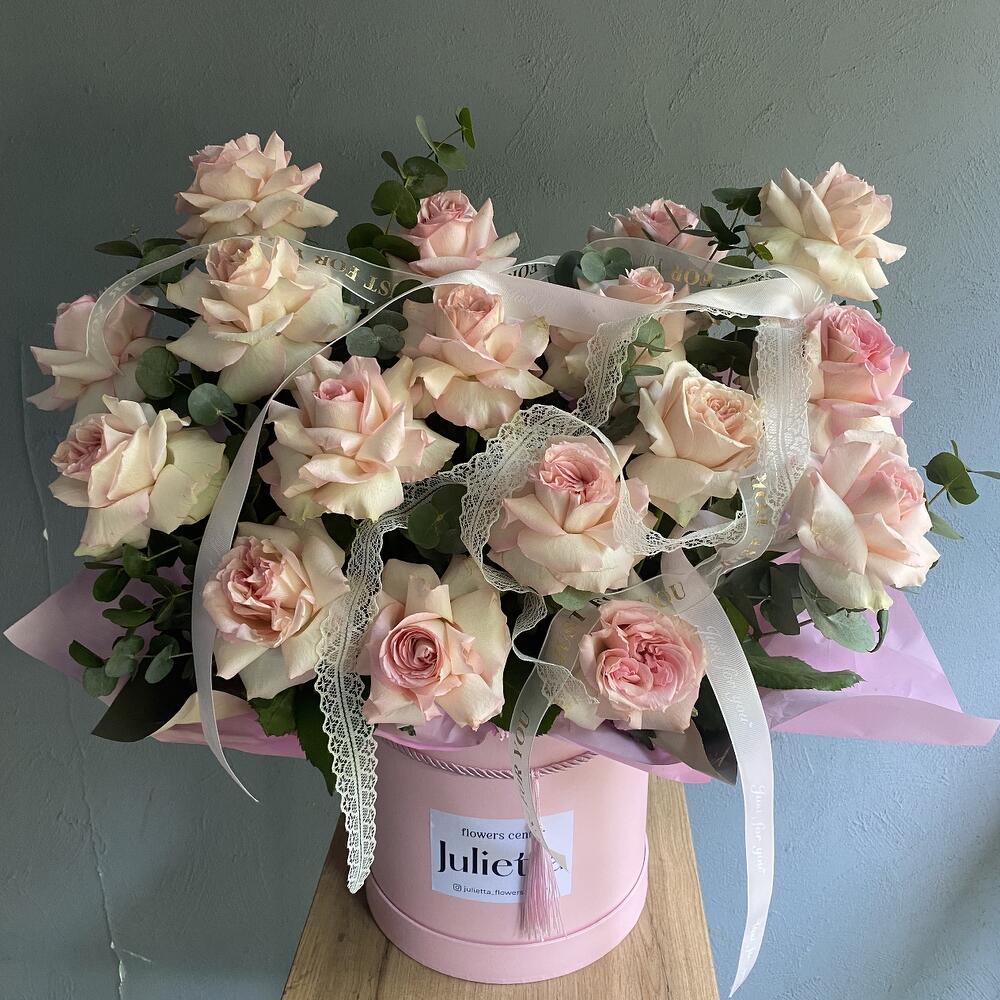 Цветочная композиция в коробке из французских роз с добавлением эвкалипта