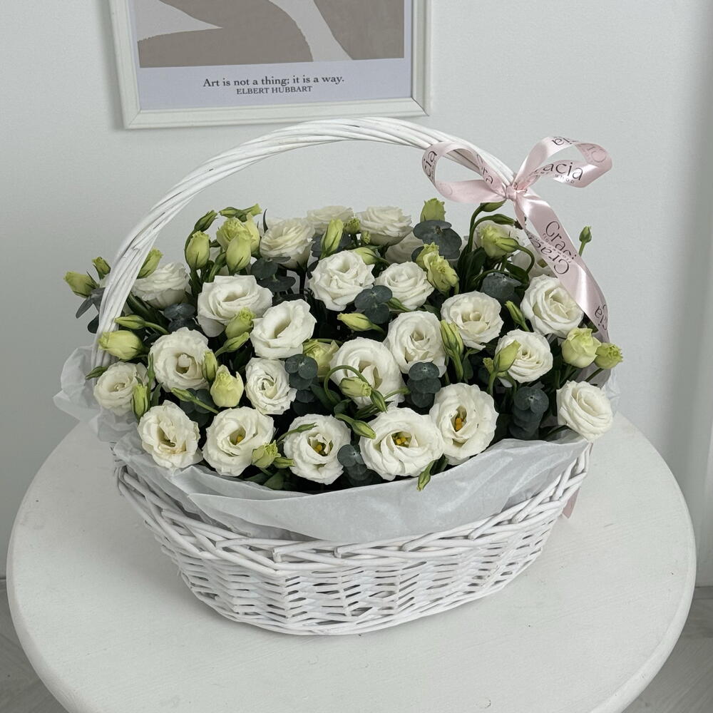 Эустома M өлшемдегі себетте, 40*35см, эвкалипт қосылған Құттықтауға тамаша нұсқа🥰