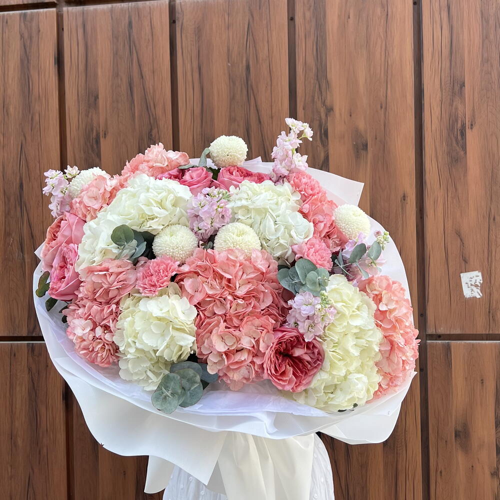 Гортензия - 9 дана Маттиола - 5 дана Эвкалипт - 3 дана Раушан - 5 дана Гвоздика - 3 дана хризантемаодноголовая - 5 дана