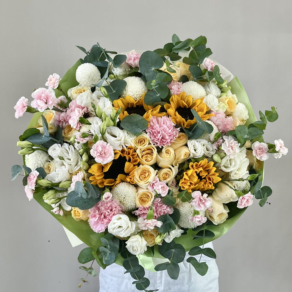 Лизиантус - 10 дана Раушан - 35 дана Диантус - 15 дана Хризантема одноголовая - 8 дана Эвкалипт Baby Blue - 3 дана Подсолнух желтый - 4 дана