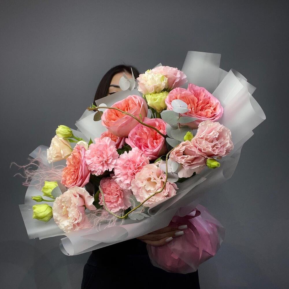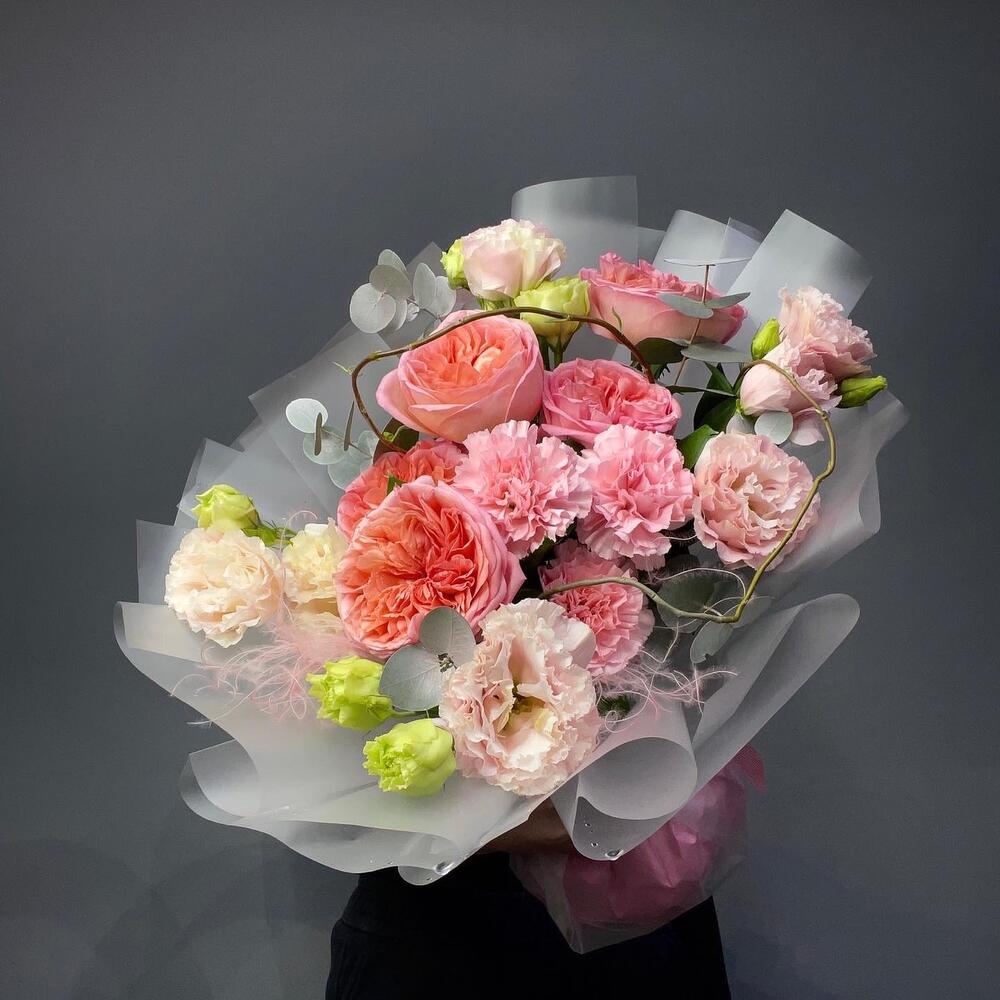 Лизиантус - 5 дана Диантус - 3 дана Роза пионовидная - 3 дана Корилус - 1 дана Эвкалипт Baby Blue - 2 дана
