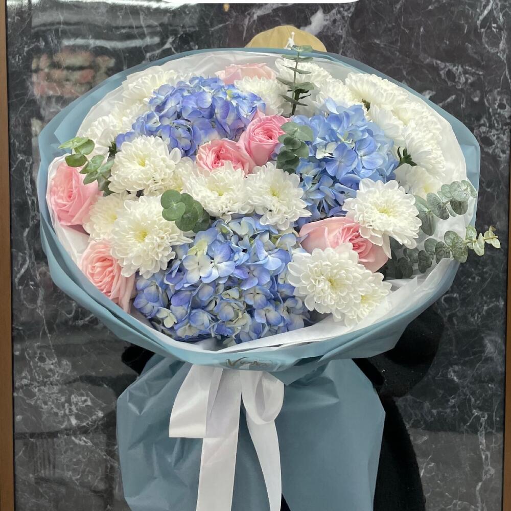 Гортензия - 3 дана Хризантема бұтасы - 5 дана Эвкалипт - 1 дана Раушан - 6 дана