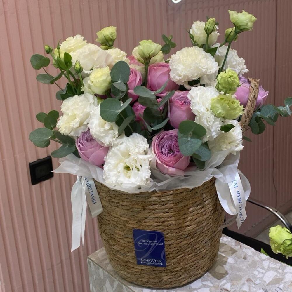 Эвкалипт - 1 дана Эустома - 10 дана Кашпо - 1 дана одноголовые пионовидные розы - 11 дана