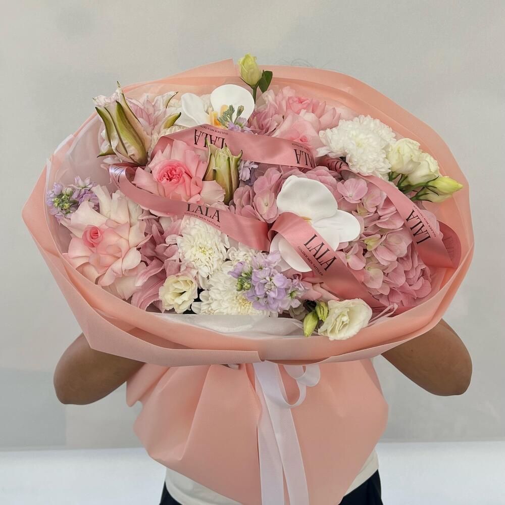 Гортензия - 1 дана Лизиантус - 2 дана Лилия - 2 дана Маттиола - 3 дана Хризантема бұтасы - 3 дана Раушан - 5 дана Орхидея искусственная - 2 дана