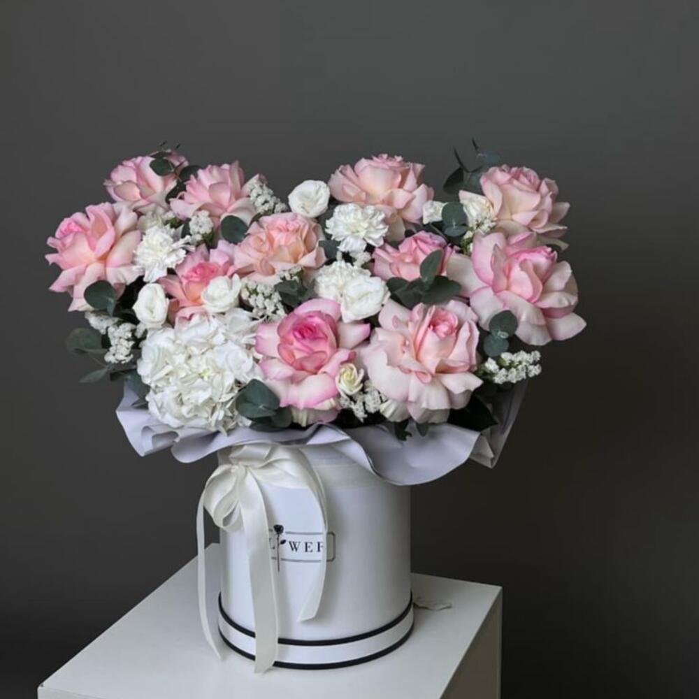 Гортензия - 1 дана Статица - 2 дана Раушан - 11 дана Гвоздика - 3 дана Эустома - 2 дана Қорап - 1 дана