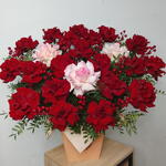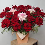 Бұл әсем қораптағы композиция жарқын қызыл және қызғылт француз раушандарының үйлесімін ұсынады. Фисташка бұтақшалары жаңа леп пен нәзіктік қосып, үйлесімді ансамбль жасайды. Әрбір гүл махаббатпен таңдалып, букеттің сұлулығы мен әсемдігін айқындайды. Бұл композиция кез келген жағдайға тамаша сыйлық немесе интерьеріңіздің сәнді әшекейі болады.