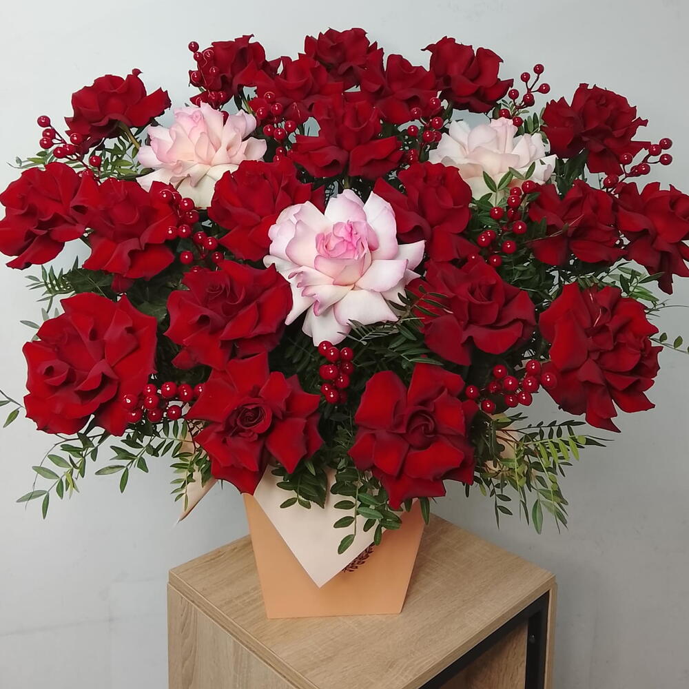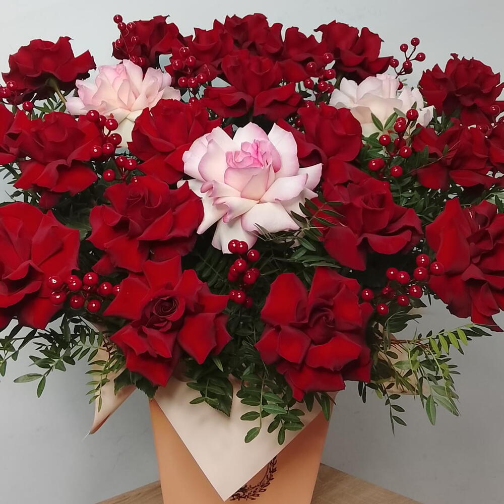 Бұл әсем қораптағы композиция жарқын қызыл және қызғылт француз раушандарының үйлесімін ұсынады. Фисташка бұтақшалары жаңа леп пен нәзіктік қосып, үйлесімді ансамбль жасайды. Әрбір гүл махаббатпен таңдалып, букеттің сұлулығы мен әсемдігін айқындайды. Бұл композиция кез келген жағдайға тамаша сыйлық немесе интерьеріңіздің сәнді әшекейі болады.