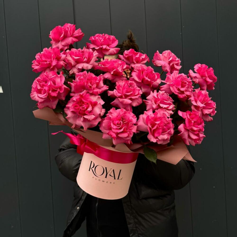 Роскошный букет насыщенно-розовых роз в стильном оформлении. Этот букет привлекает внимание своей яркостью и изысканностью.