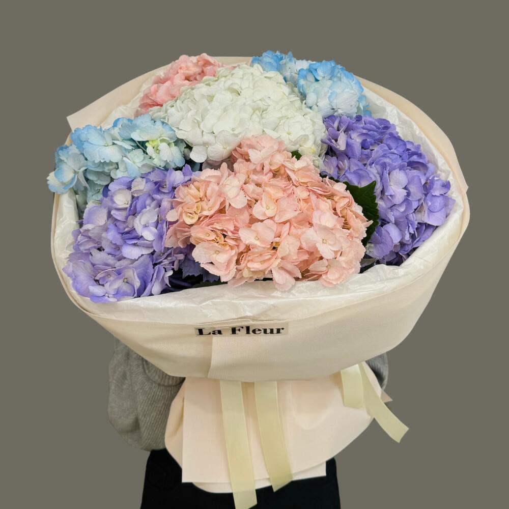 Настоящий «вау-эффект»! Яркий, масштабный и запоминающийся букет из 9 гортензий разных цветов. Для самого важного повода или особенного человека.